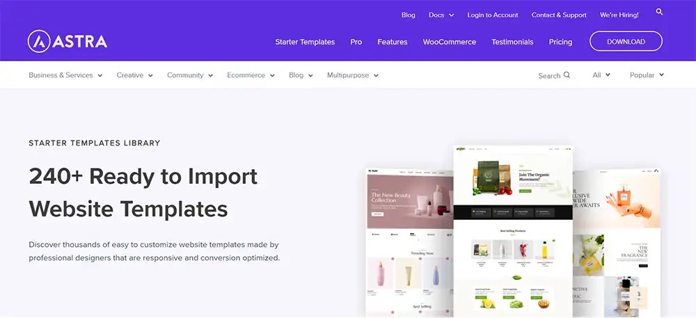 Với Astra theme và tính năng Premium Starter Templates Pro, người dùng có thể tạo ra trang web của mình chỉ trong vài phút, với đầy đủ các trang cơ bản như trang chủ, giới thiệu, sản phẩm, liên hệ, v.v. Tính năng này cung cấp cho người dùng hơn 240 mẫu giao diện khác nhau, được chia sẻ trên trang web của Astra theme, với nhiều chủ đề khác nhau như cửa hàng trực tuyến, trang web cá nhân, trang web doanh nghiệp, v.v.