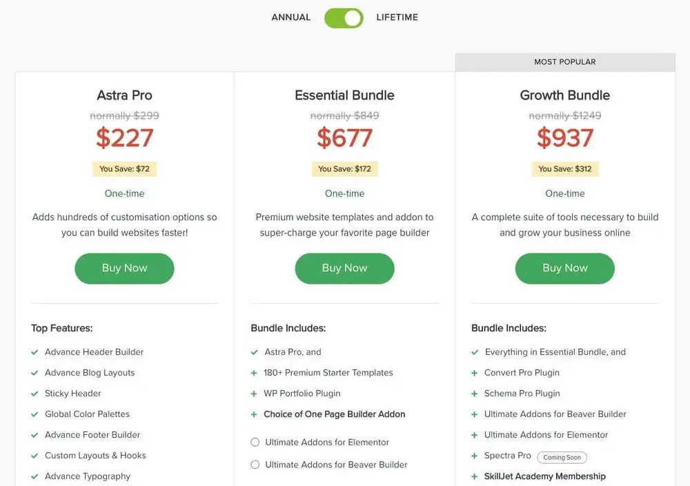 Bảng so sánh giá các gói Astra theme