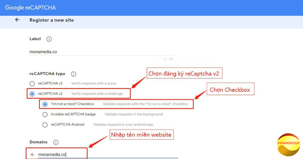 Choose the type of reCAPTCHA: Bạn chọn loại reCAPTCHA mà bạn muốn đăng ký là reCAPTCHA v2 hoặc reCAPTCHA v3.
