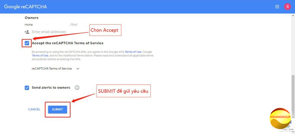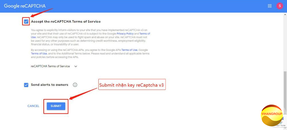 Tiếp đến, check vào ô Accept the reCAPTCHA Terms of Service – chấp nhận điều khoản của Google.