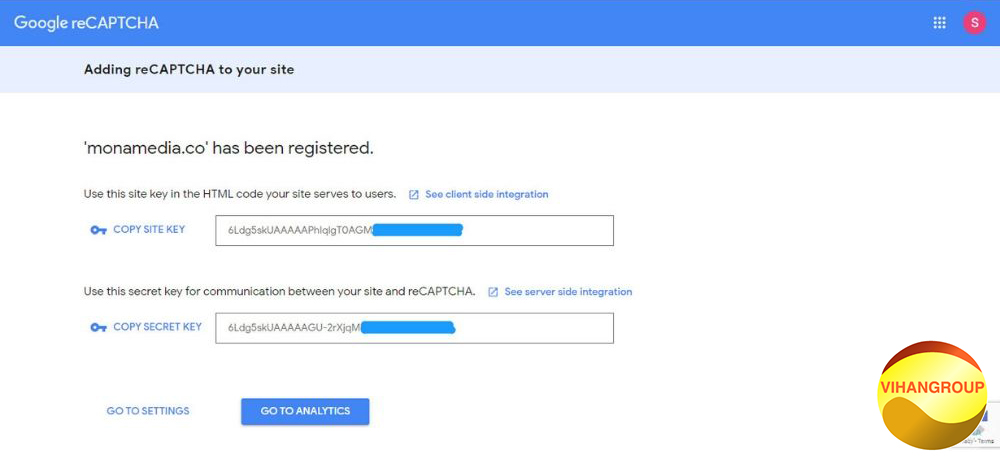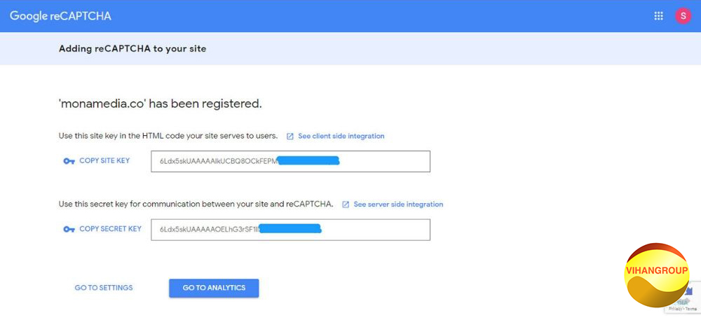 Kết quả là bạn cũng sẽ nhận được 2 giá trị Site Key và Secret Key.