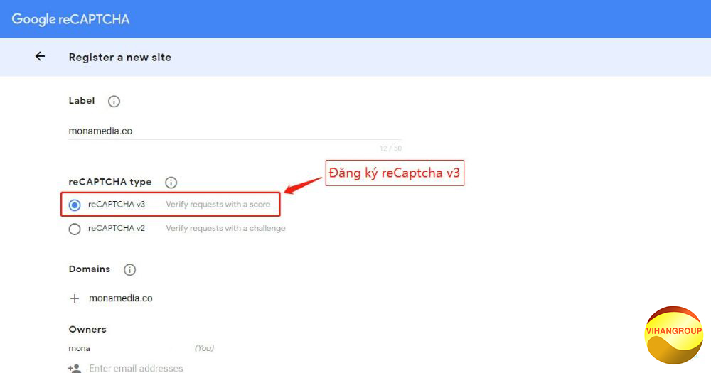 Đăng ký reCaptcha v3 chỉ có một tùy chọn.