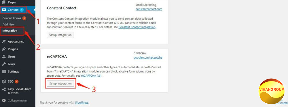 Bước 2: Chọn Form liên hệ > Tích hợp > reCAPTCHA > Setup Integration