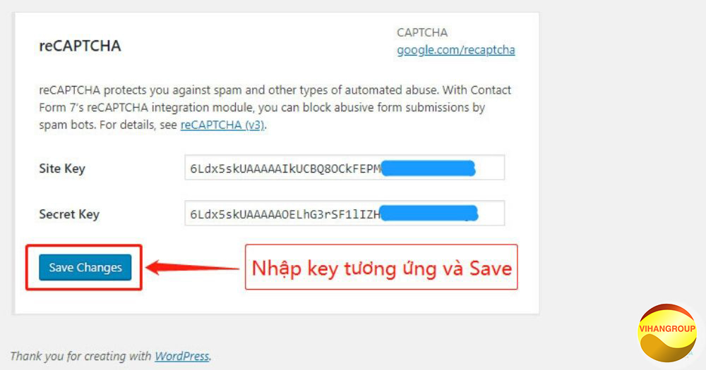 Sau đó, dán Site Key và Secret Key vào và click Save Changes
