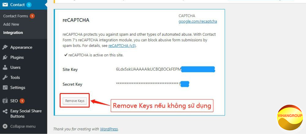 Ngoài ra, nếu bạn không muốn sử dụng reCaptcha cho website của mình, chỉ cần vào lại phần Tích hợp (trong mục Contact Form 7) => reCaptcha => Setup Integration => Remove Keys