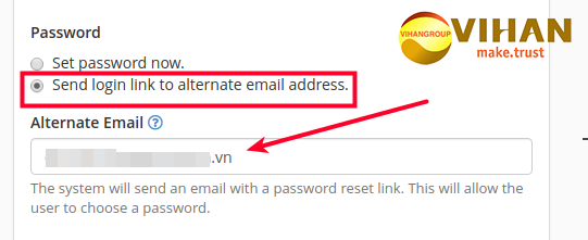 Cũng giống như ở phần trên nhưng ở phần Password ta chọn “Send login link to alternate email address” và Nhập email muốn nhận link đặt mật khẩu.