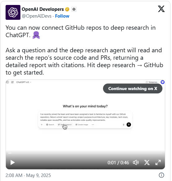OpenAI đã cập nhật tính năng mới cho phép người dùng kết nối kho lưu trữ GitHub của mình với công cụ nghiên cứu Deep Research trong ChatGPT. Hiện tại, tính năng này đang trong giai đoạn thử nghiệm beta và được kỳ vọng sẽ giúp các lập trình viên và nhóm phát triển dễ dàng phân tích mã nguồn cũng như các yêu cầu kéo (pull requests), tạo ra những báo cáo chi tiết có trích dẫn rõ ràng.