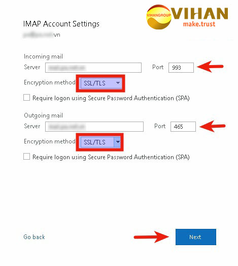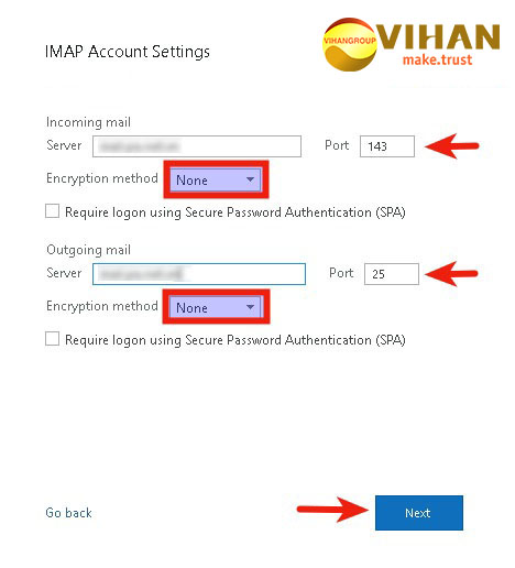 Outgoing mail server: bạn nhập vào máy chủ gửi mail (thông tin này sẽ được cung cấp qua Email đăng ký dịch vụ)