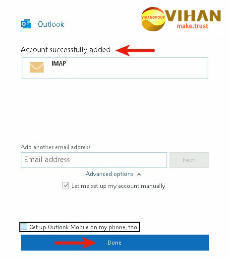Thông báo tài khoản đã được thêm vào thành công, chọn Done để hoàn tất cấu hình.