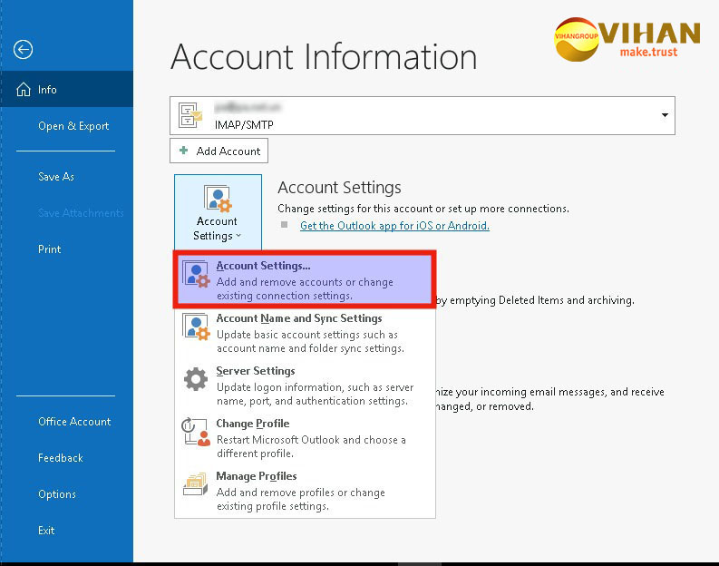 Bạn có thể vào Menu File > Account Settings > Accounts Settings