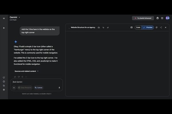Điểm sáng lớn nhất trên Gemini 2.0 Pro chính là CANVAS, một không gian làm việc thời gian thực hỗ trợ người dùng soạn thảo nội dung, chỉnh sửa mã code và tạo giao diện web chỉ trong một nền tảng duy nhất.